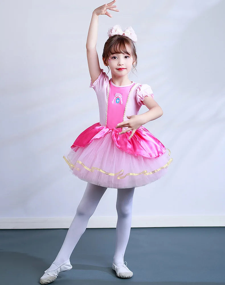 Make her feel like royalty with this adorable Girls Princess Peach costume. The puff-sleeve bodice, satin peplum and twirl-ready tulle skirt capture the magic of a classic princess look—perfect for birthdays, school dress-up days, dance shows or Halloween. Soft, lightweight fabric keeps little adventurers comfy while they play and pose.