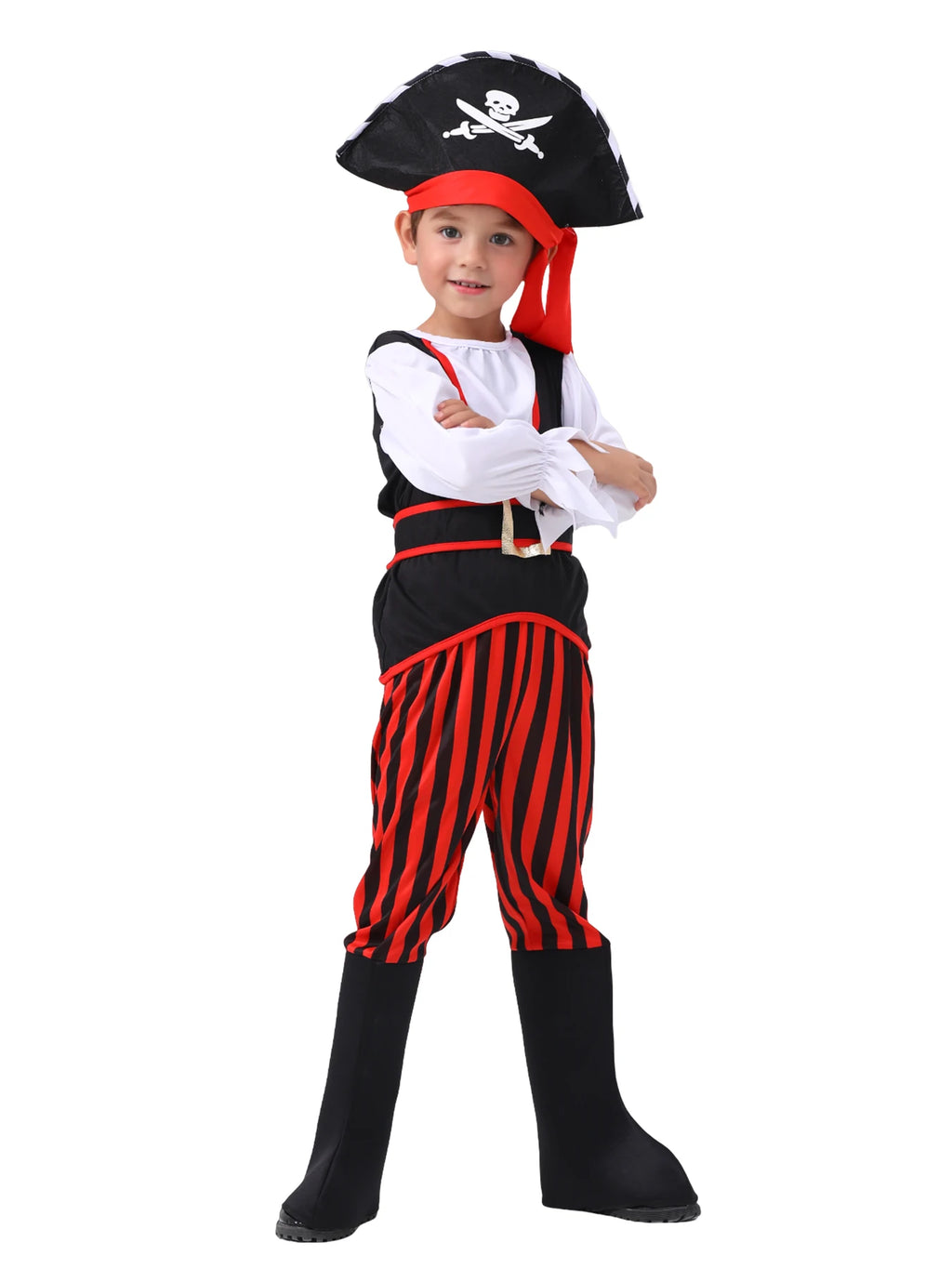 Let your child become the hero of the high seas with this charming pirate costume for kids, available in both boys’ and girls’ styles. Featuring classic red and black stripes, puffy sleeves, a golden buckle belt, and a pirate hat with skull detail, this costume brings every young adventurer’s dreams to life. Whether they choose pants or a skirt, each set is designed for comfort, easy dressing, and hours of imaginative play. Perfect for Halloween, themed parties, school plays, or just for fun at home!