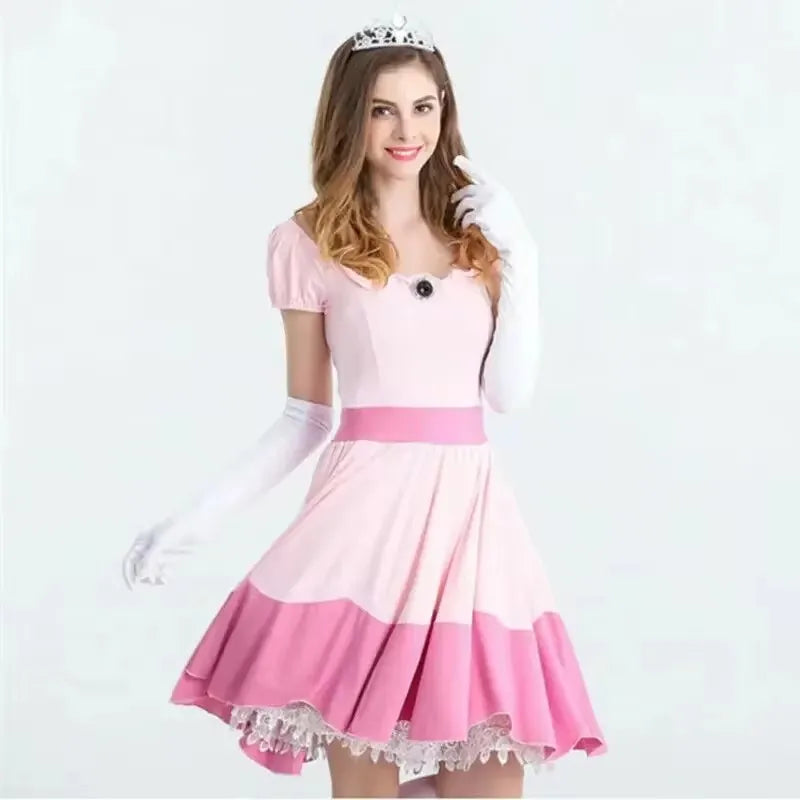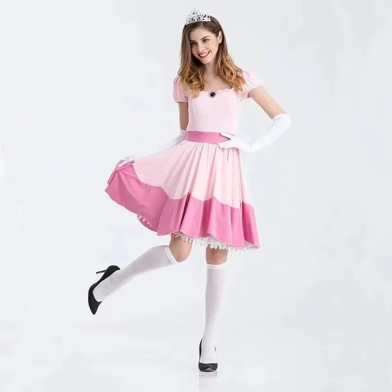 Rule the Mushroom Kingdom at your next event with this elegant Princess Peach costume for adults. The twirl-ready skirt, soft puff sleeves and scalloped hem capture the princess look perfectly—ideal for cosplay, Halloween, themed parties or photoshoots. Lightweight and comfy so you can dance all night.