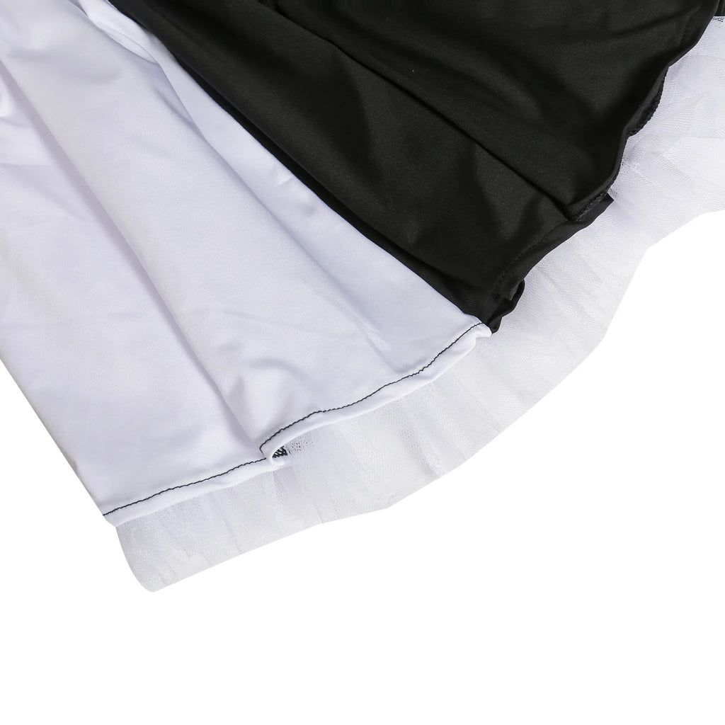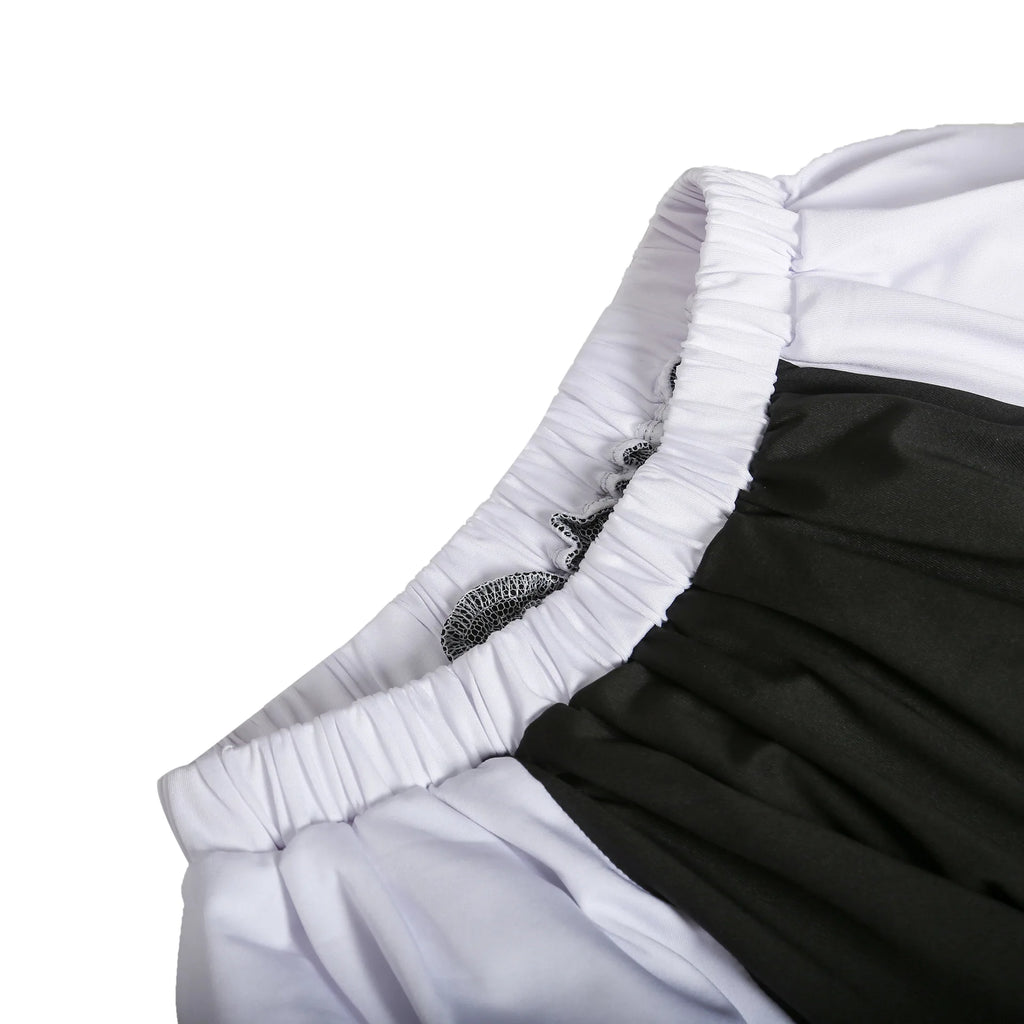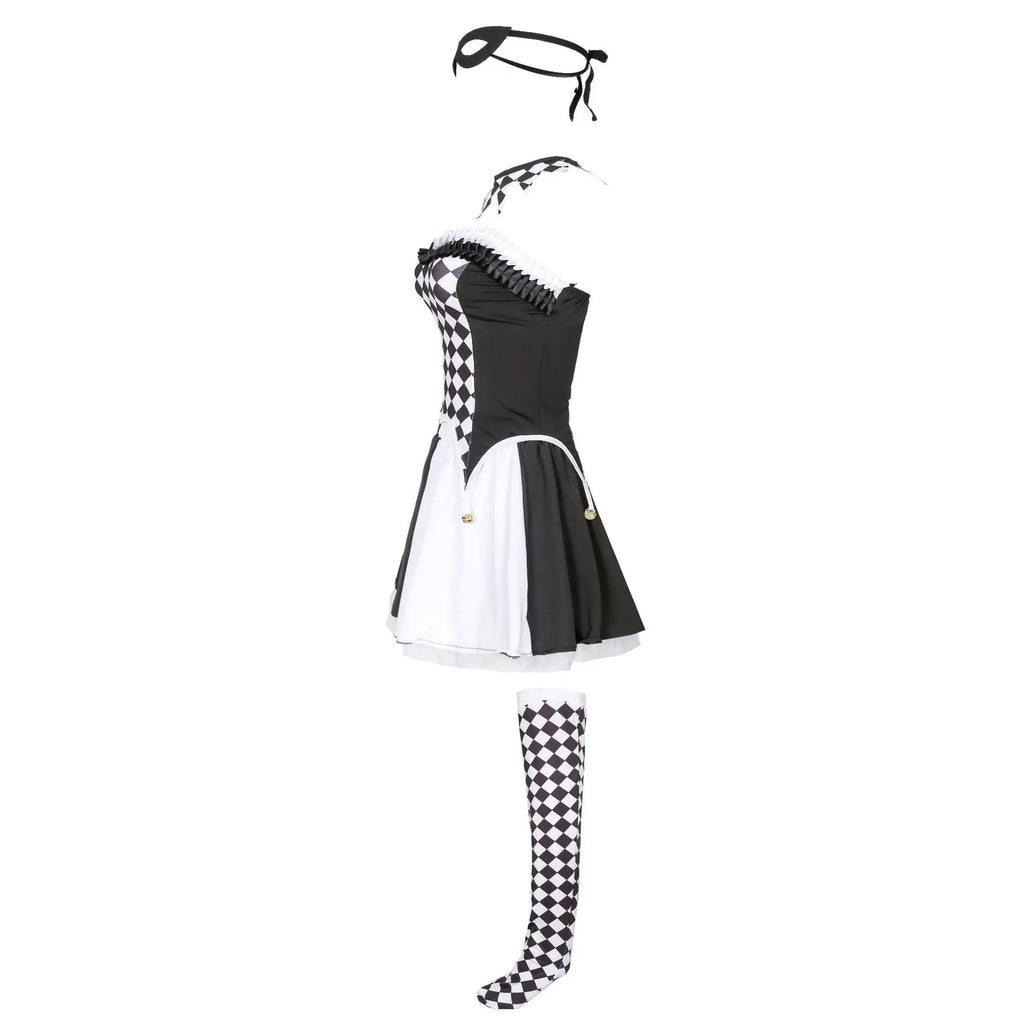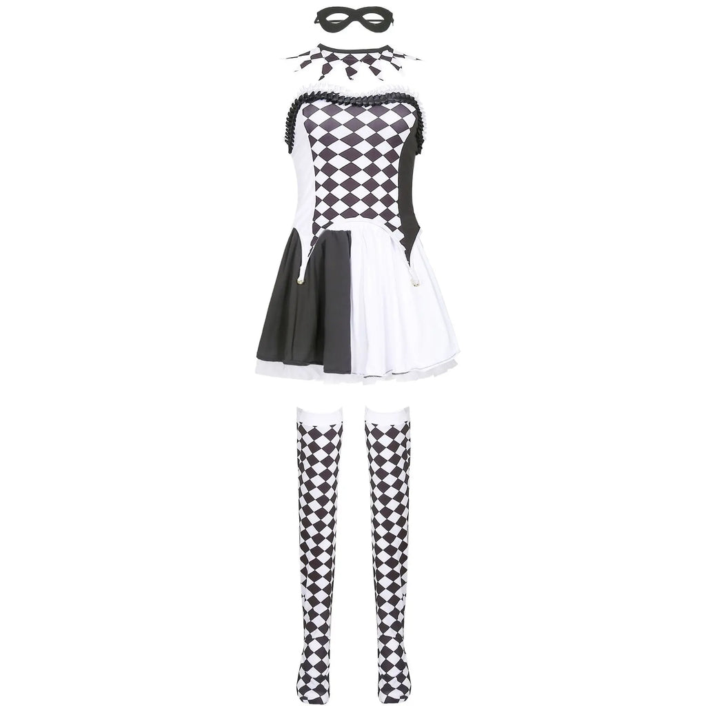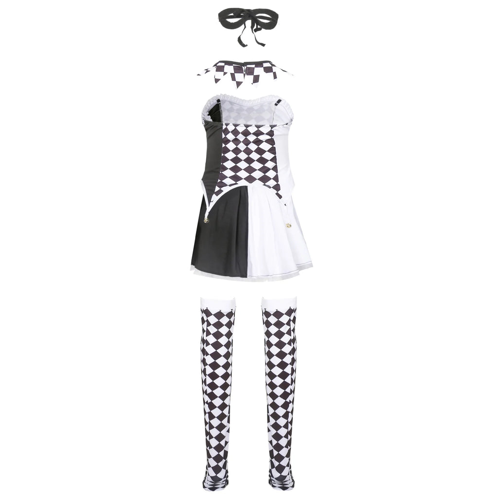 This eye-catching costume includes a flattering corset dress designed to accentuate your curves, featuring a black and white diamond pattern that is unmistakably Harley Quinn. The short, flirty skirt adds a touch of fun and movement, perfect for dancing the night away. The costume also comes with matching black and white diamond-patterned stockings, a choker, and a black eye mask, adding an extra layer of authenticity and allure.