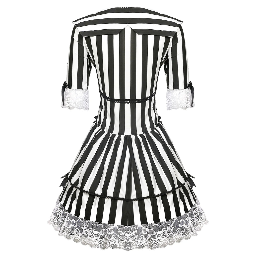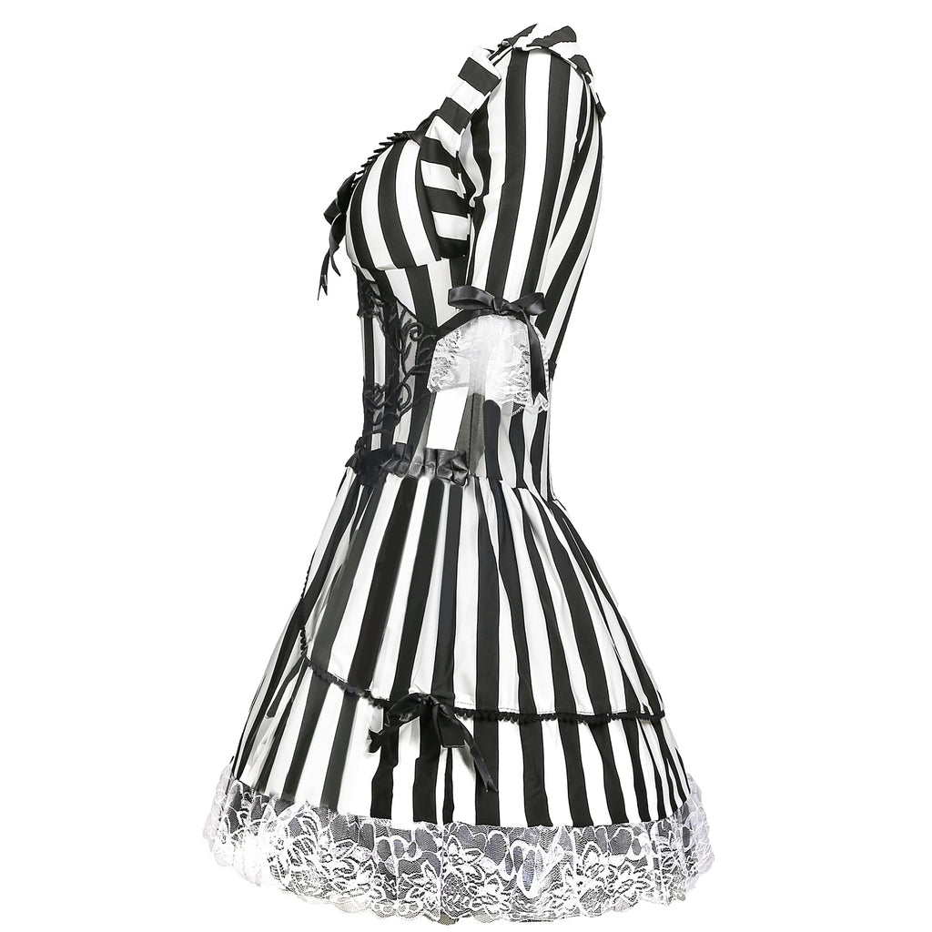 Dare to dazzle with a dark twist in this theatrical circus clown costume for women. With its bold black and white stripes, lace trims and corset-style bodice, this dress blends gothic glamour with vintage circus flair. Perfect for Halloween, themed parties or cosplay events, it’s an unforgettable statement piece that captures the spotlight.