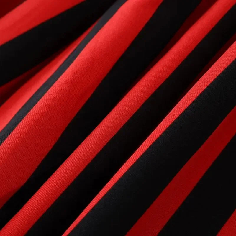 - Iconic red and black striped pattern with a jagged hem